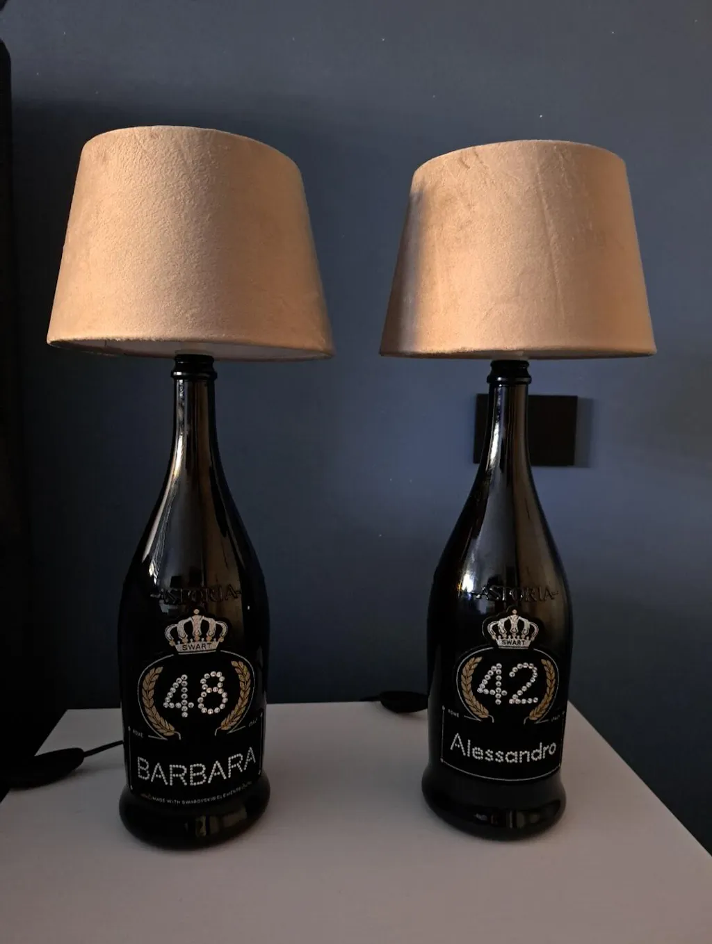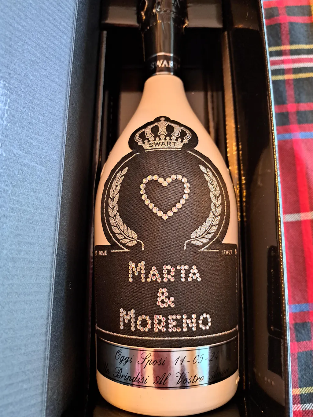 Personalizza con nome, data e dedica incisi artigianalmente su pregiata bottiglia di spumante ornata da cristalli scintillanti in raffinato finish bianco. Confezione regalo inclusa. Un ricordo che resterà esposto come simbolo del vostro amore.